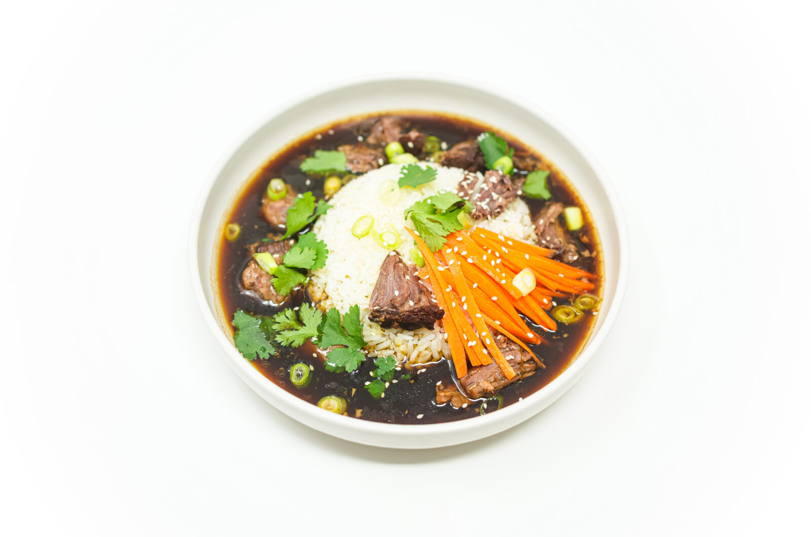 Place a mound of jasmine rice in the center of a bowl. Arrange braised oxtail around the rice. Ladle the rich, aromatic broth over everything. Garnish with pickled carrots, green onions, fresh cilantro, sesame seeds, and a squeeze of lime.