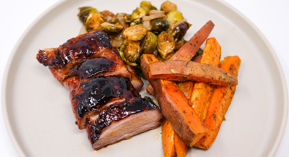 Balsamic Glazed Pork Belly, Caramelized Brussels Sprouts, & Herb-Roasted Sweet Potato Wedges