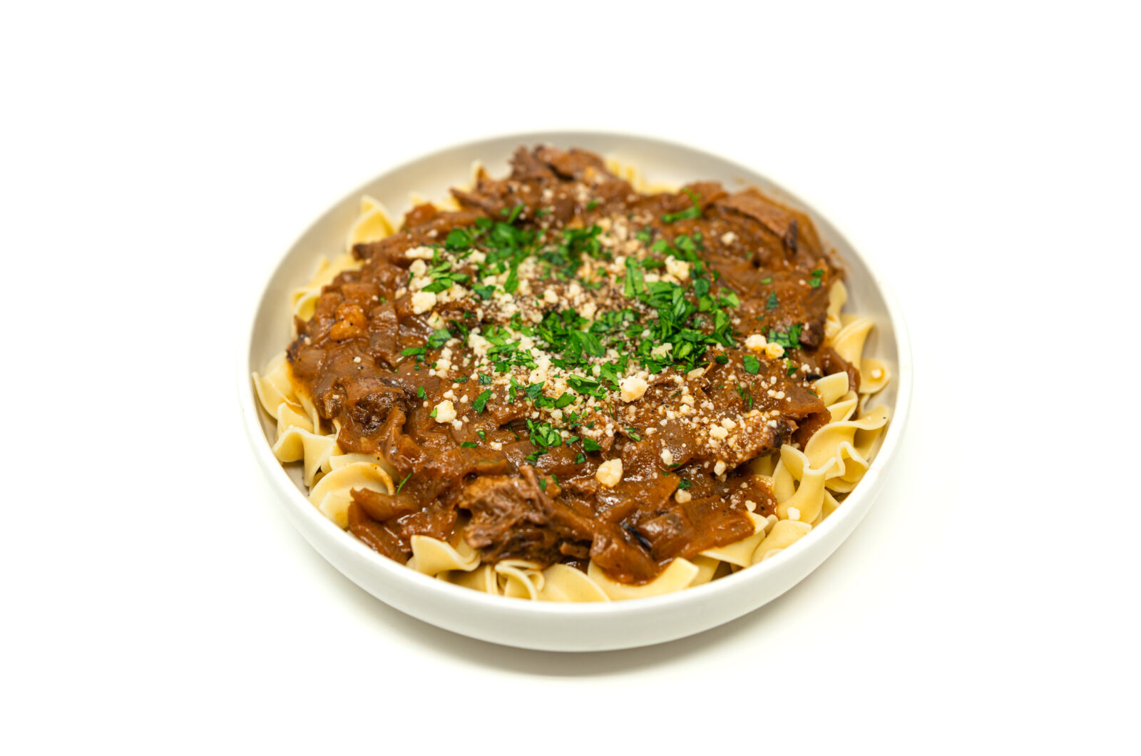 Rich, savory beef melts into a dark and intensely spiced caramelized onion gravy. Served over hot egg noodles, it offers the ultimate comfort on a cold night.