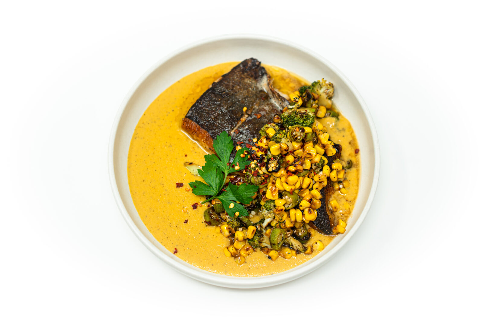 minutesSeared black cod is rich and buttery with crisp golden skin that melts into a smooth corn cream made from charred corn. A warm salad of charred corn, okra, and broccoli adds smoky depth and freshness to round out the plate.
