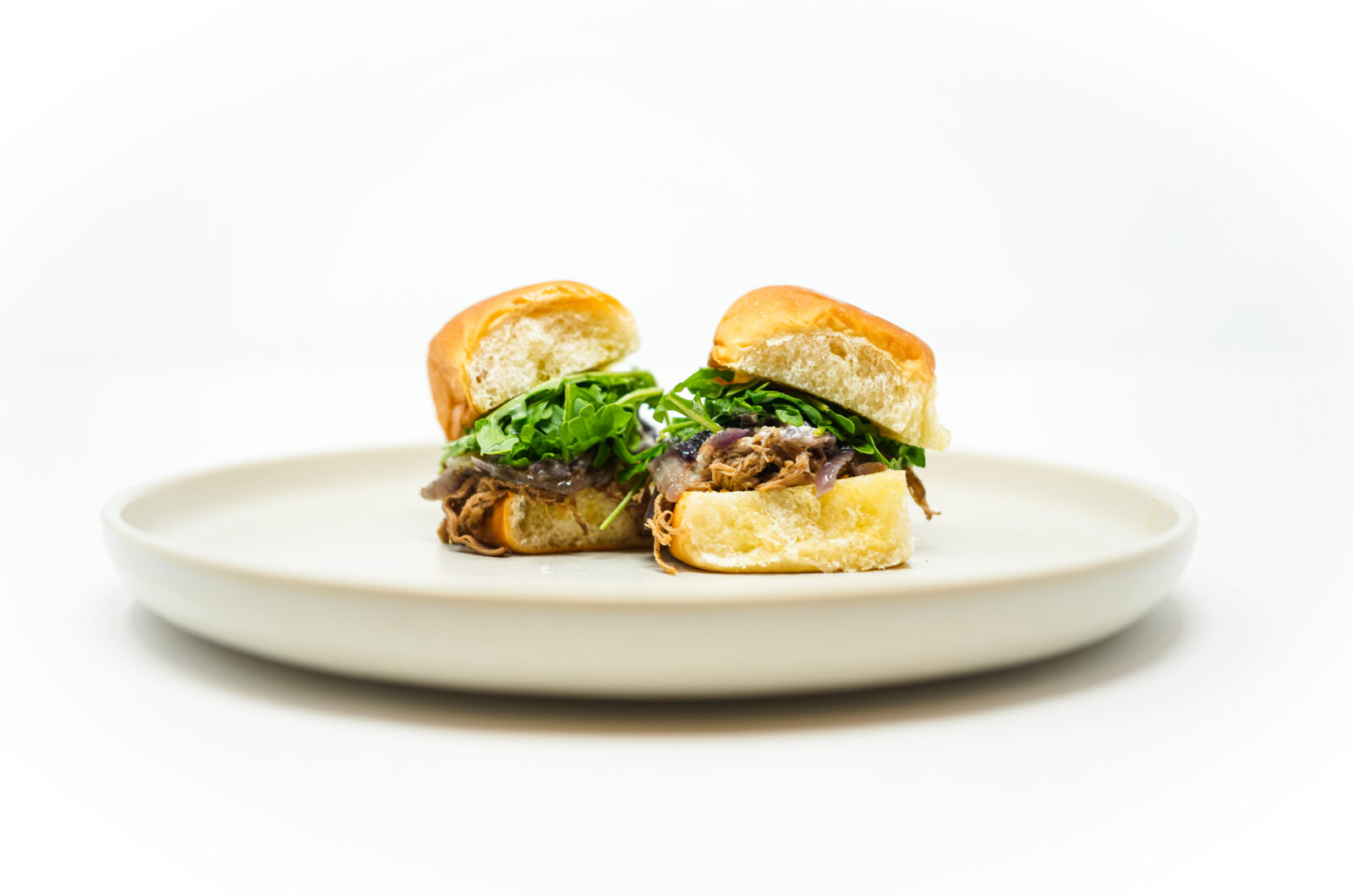 Slice and toast the slider buns. Spread horseradish aioli on the top and bottom halves of each bun. Layer with shredded braised pork, caramelized onions, and a handful of fresh arugula.