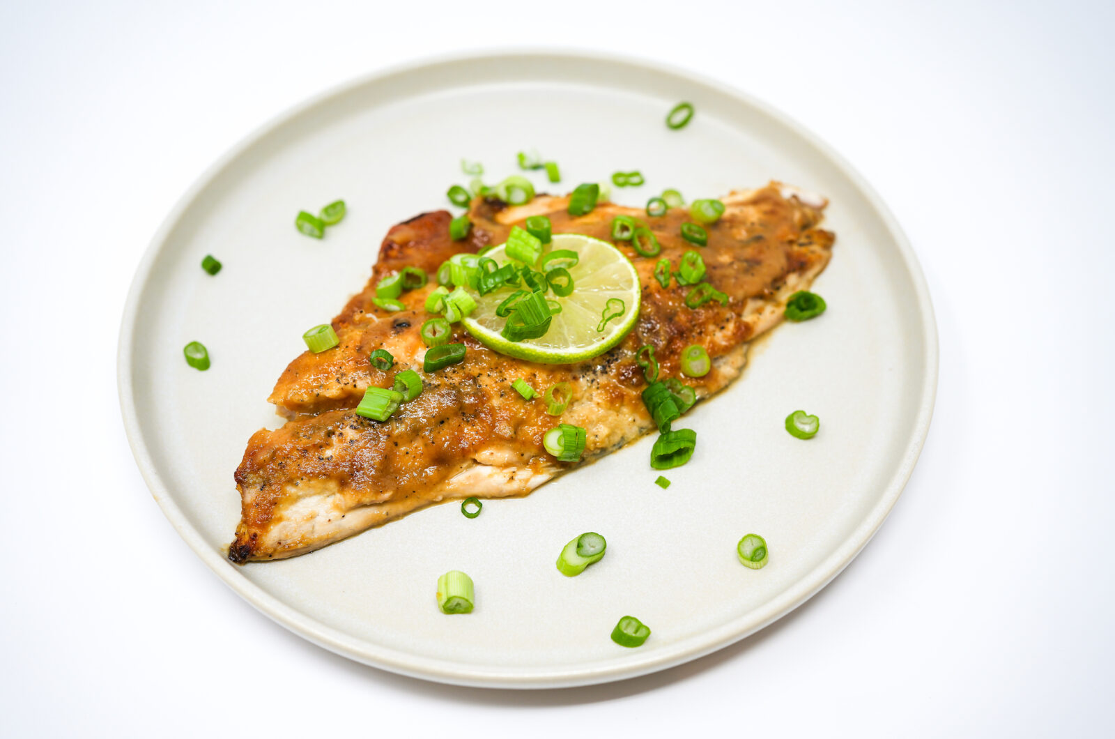 Remove the chipotle-plum glazed triple tail snapper fillets from the oven. Garnish with freshly chopped green onions, a slice of lime, and serve immediately.