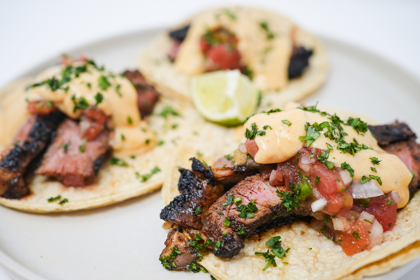 hourCoffee-Ancho Sirloin Steak Tacos with Pepper Jack Sauce feature smoky, spice-rubbed sirloin and a creamy, spicy cheese sauce, all topped with fresh salsa for a flavorful twist on the classic taco.