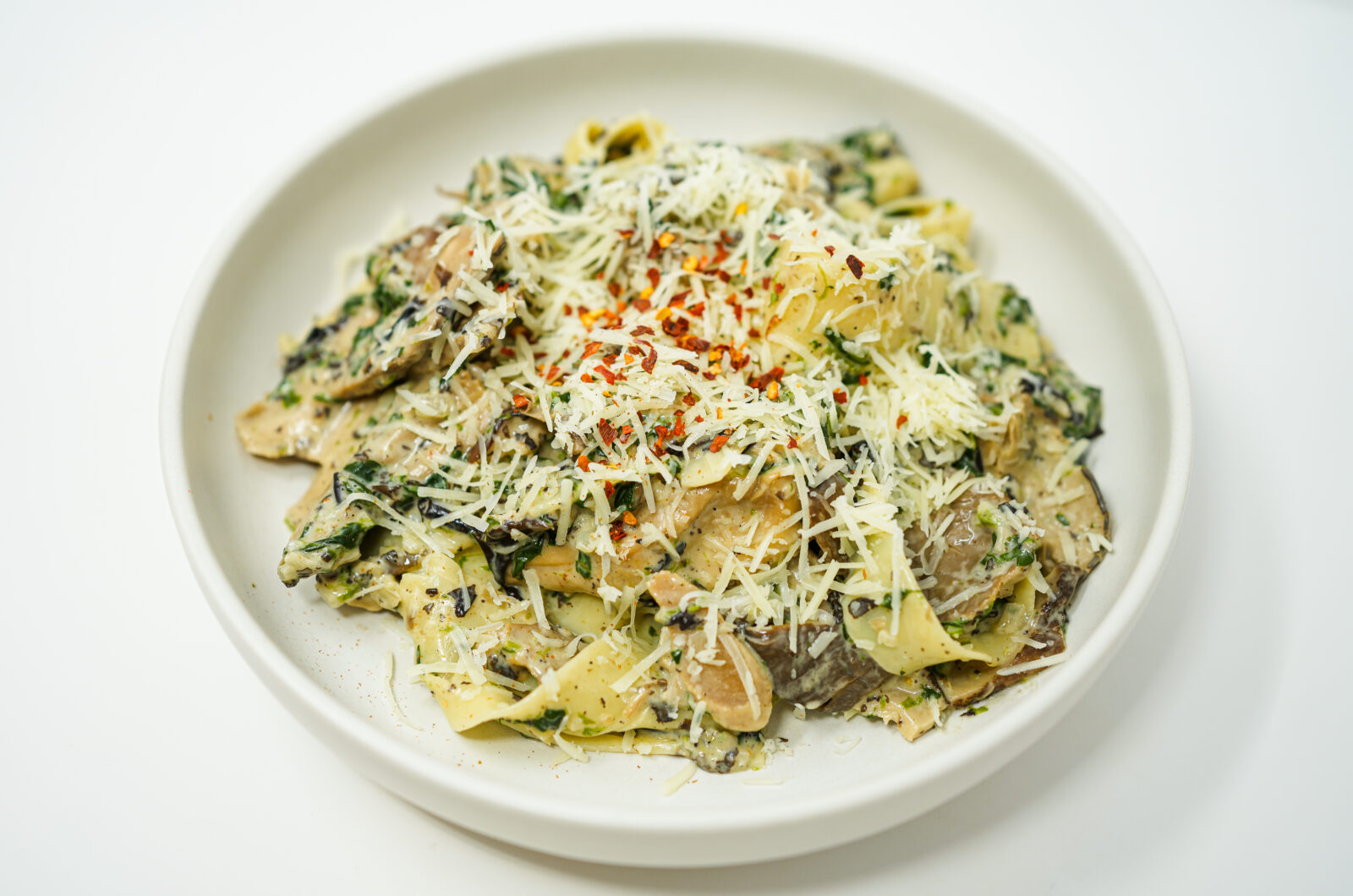 Dish out the Creamy Spinach and Wild Mushroom Pappardelle with additional Parmesan cheese and a sprinkle of red pepper flakes for a burst of flavor and heat.