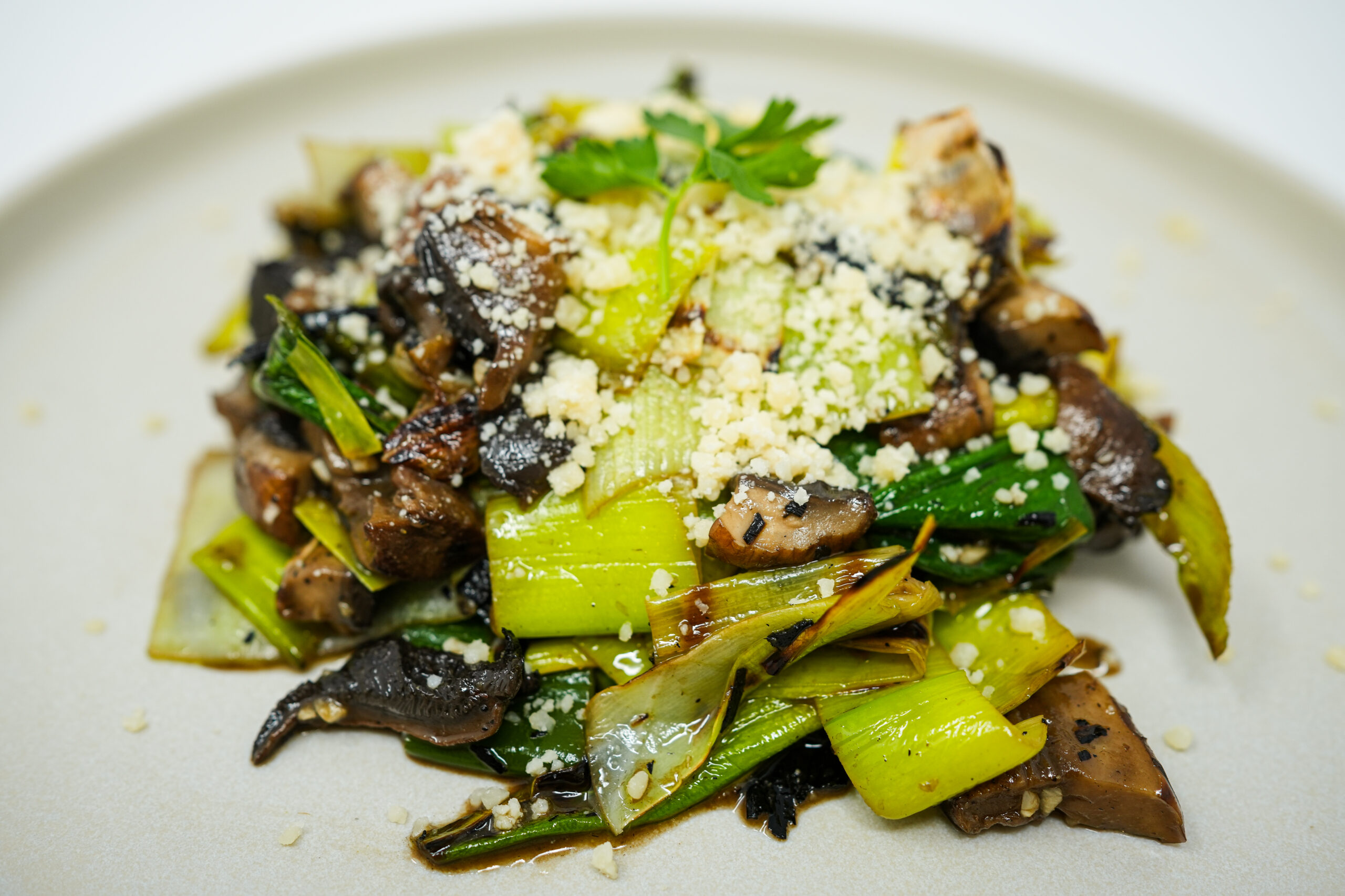 This salad is about individual ingredients and how they come together in perfect balance. The smoky warmth of the grilled mushrooms and leeks contrasts beautifully with the bright tang of the dressing, while the Parmesan adds depth and the parsley ties everything together with its refreshing vibrancy. Visually, the dish is stunning: the earthy tones of the mushrooms and leeks are offset by the green of the parsley and the pale cream of the Parmesan, making it as pleasing to the eye as it is to the palate.