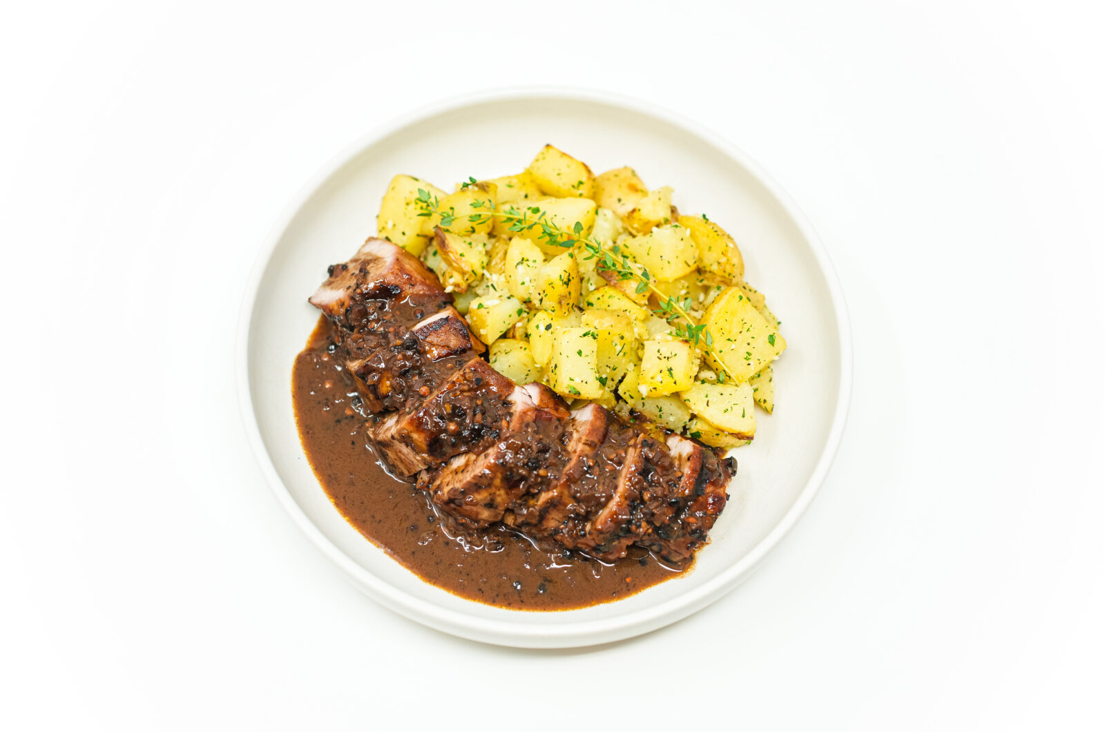 Slice the grilled pork tenderloin and arrange on a plate. Spoon the red wine black peppercorn sauce over the pork. Serve with roasted potatoes for a well rounded meal.