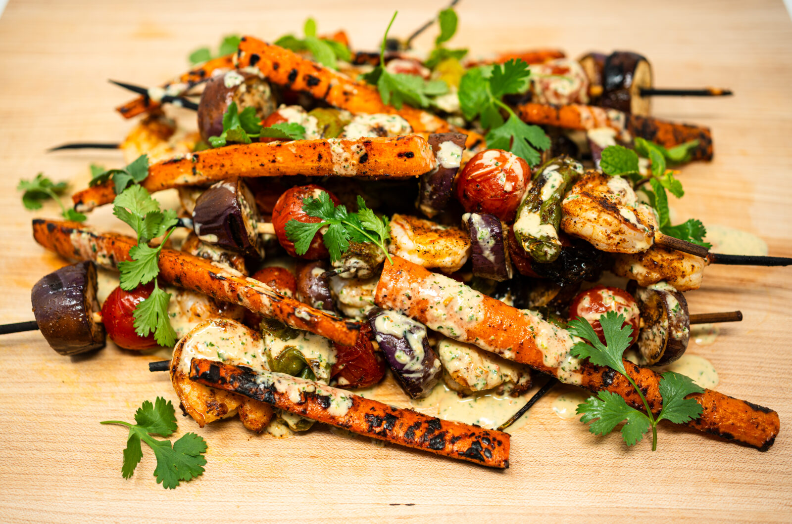 The foundation is simple: wild-caught shrimp, vegetables, fire. The jumbo shrimp are firm and sweet, just cooked through on a hot grill. They’re paired with Indian eggplant, shishito peppers, cherry tomatoes, and carrots — vegetables chosen for how they transform over flame. Some blister, some soften, all taste better with smoke.