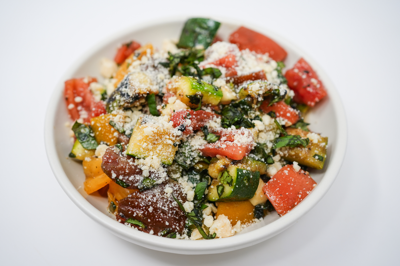 Fresh basil is roughly chopped and scattered throughout the salad, infusing it with a peppery sweetness and a hint of mint. The basil not only complements the flavors of the zucchini and tomatoes but also introduces a fresh, herbal note that ties all the elements together harmoniously.