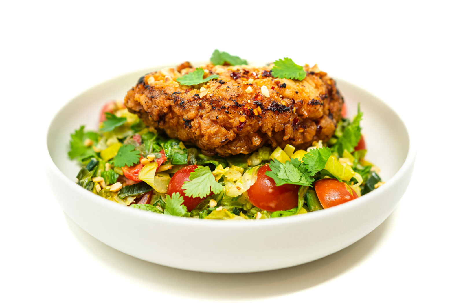 It takes some time but nothing here is complicated. Just fried chicken and roasted vegetables done right, on a salad that earns the protein instead of just holding it.