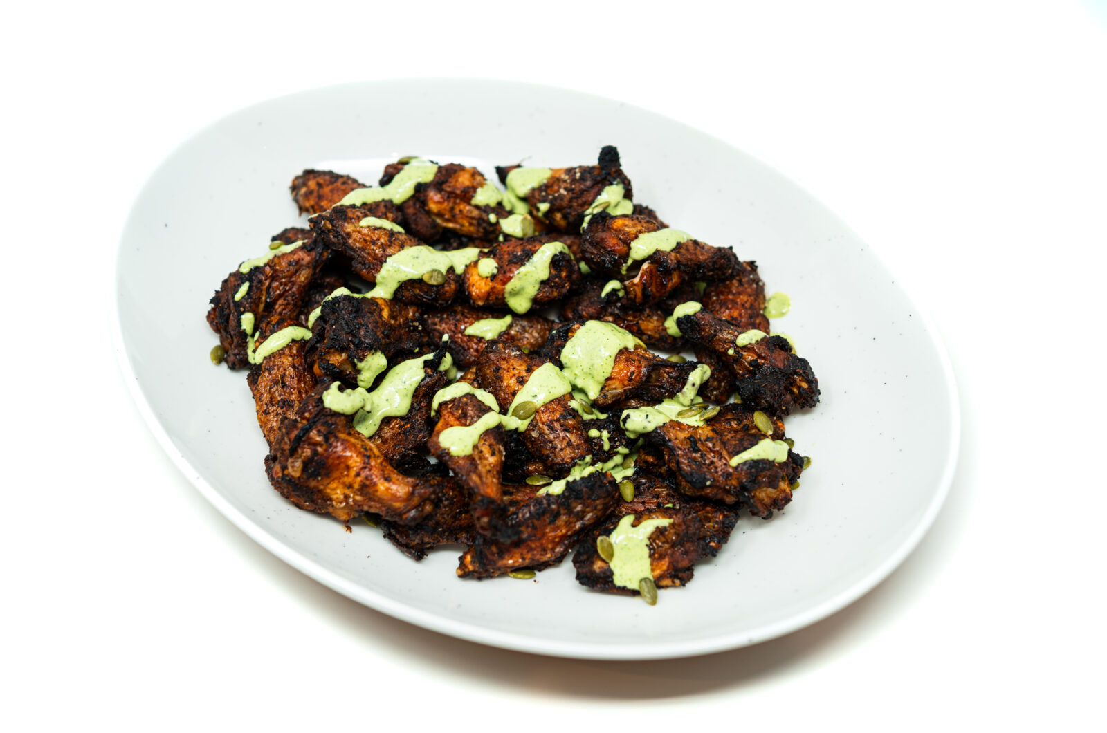 - Drizzle the wings with the jalapeño herb sauce and scatter a few pepitas or herbs on top if you like a little texture.