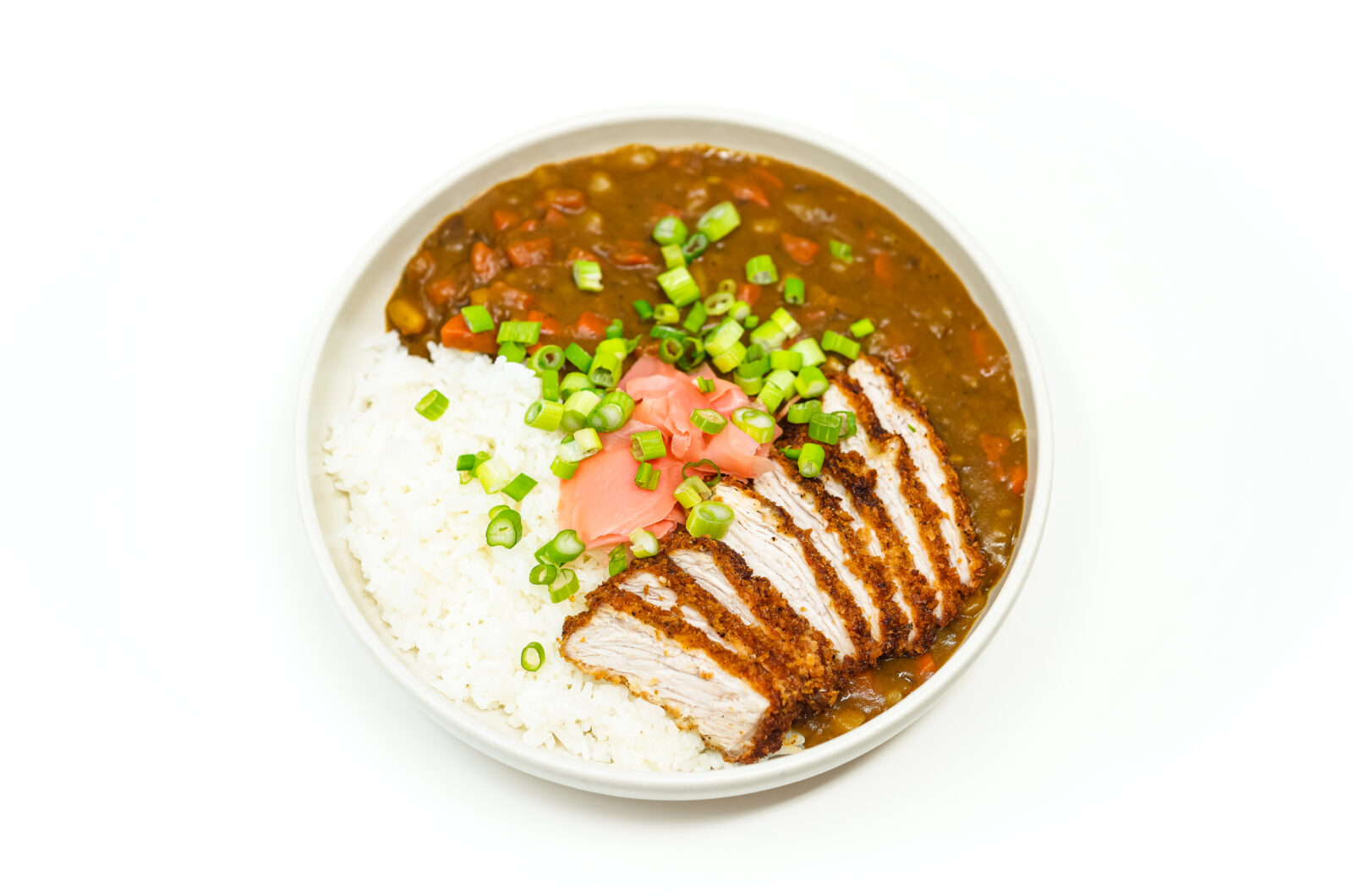 The Katsu Pork Japanese Curry Bowl combines crispy, golden pork cutlets with a rich, velvety curry sauce infused with grated pear for a touch of sweetness. Served over fluffy jasmine rice and garnished with pickled ginger and green onions, this dish is the perfect balance of textures and flavors.