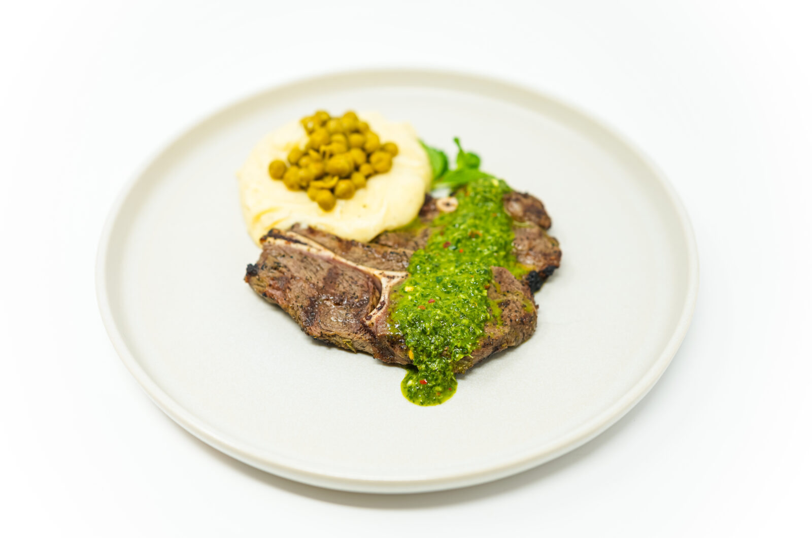 Grilled Lamb Steak with Mint Chimichurri, Whipped Mashed Potatoes, and Peas