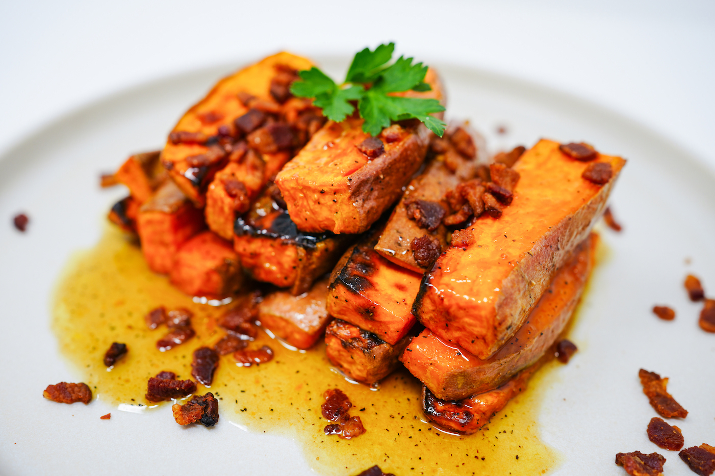 Sprinkle the crispy bacon over top of the sweet potatoes. Garnish with chopped fresh parsley for a pop of color and flavor. Serve hot as a delicious side dish.