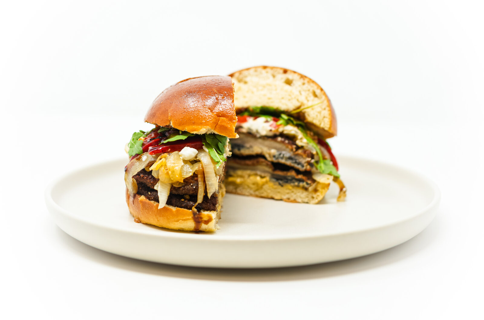 Place the fried portobello mushroom cap on the bottom half of each toasted bun. Layer the caramelized onions and roasted red peppers on top of the mushroom, followed by the crumbled goat cheese. Add a generous drizzle of balsamic glaze and a handful of fresh arugula. Lightly press the burger together and serve immediately.