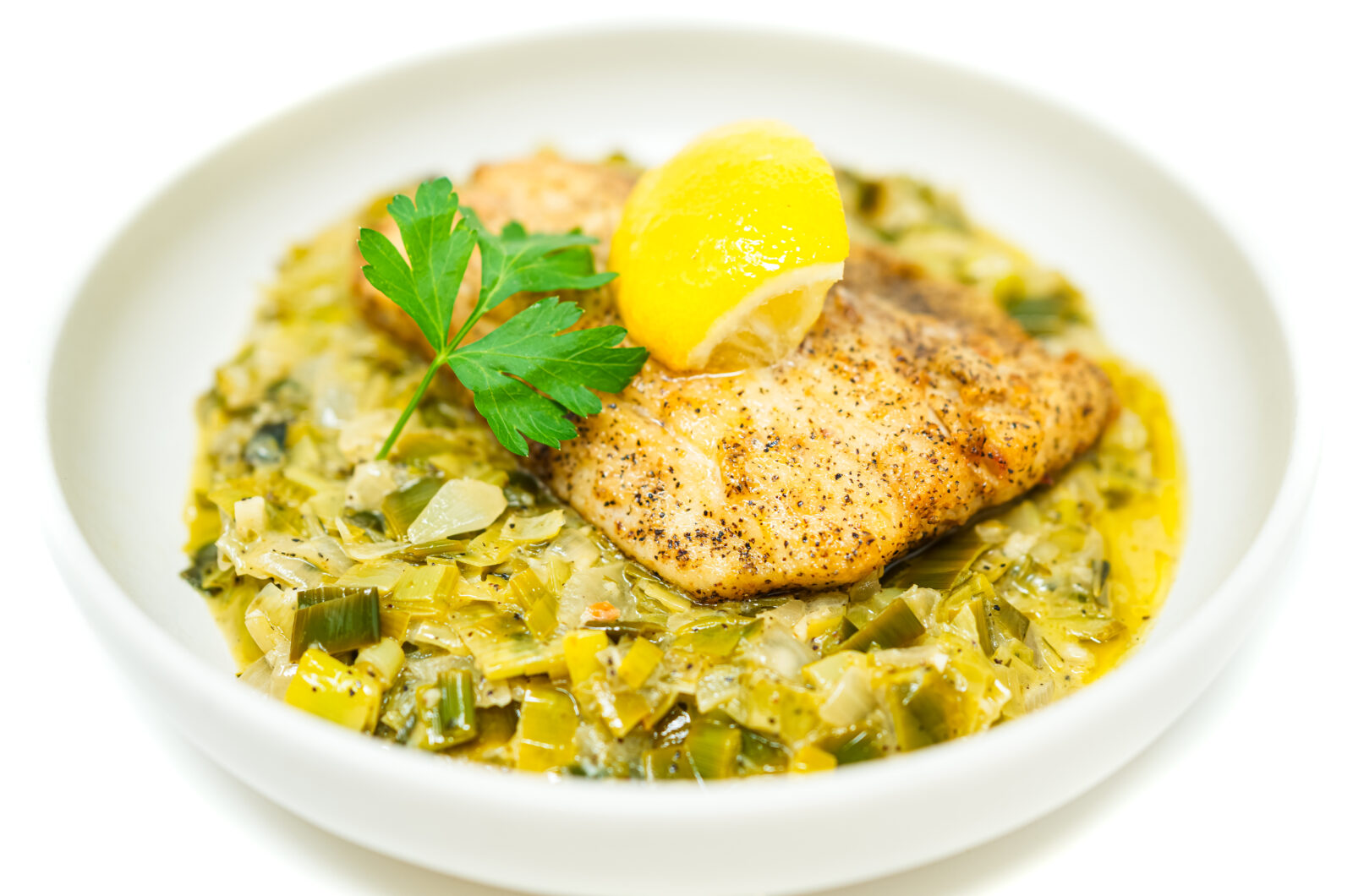 Pan-Fried Snook with Creamy Leeks Sauce is a refined dish featuring succulently crisp, golden snook atop a rich, velvety sauce of gently cooked leeks. The dish is garnished with fresh lemon slices, adding freshness to the savory flavors.