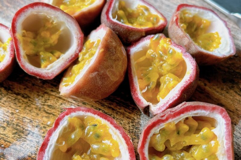 - Cut the passion fruits in half using a sharp knife. Scoop out the pulp and seeds into a bowl.