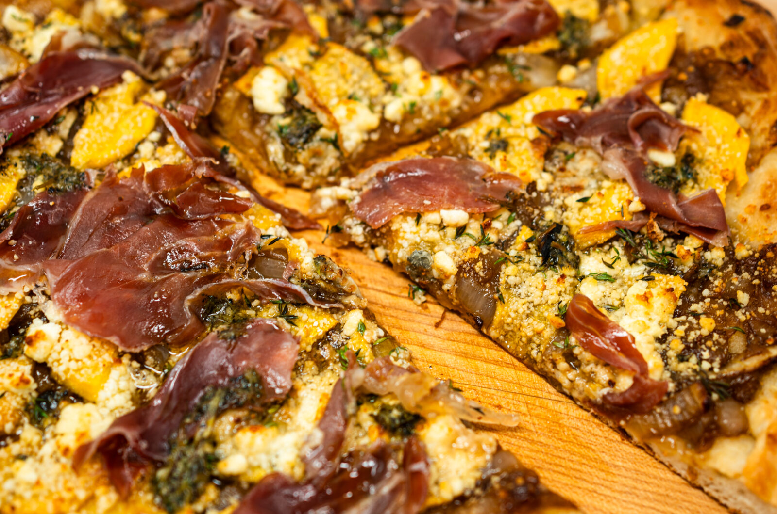 - Finish: Immediately out of the oven, drape over slices of prosciutto. Sprinkle with fresh thyme leaves, crack black pepper across the top, and a drizzle of honey. Slice and serve immediately.
