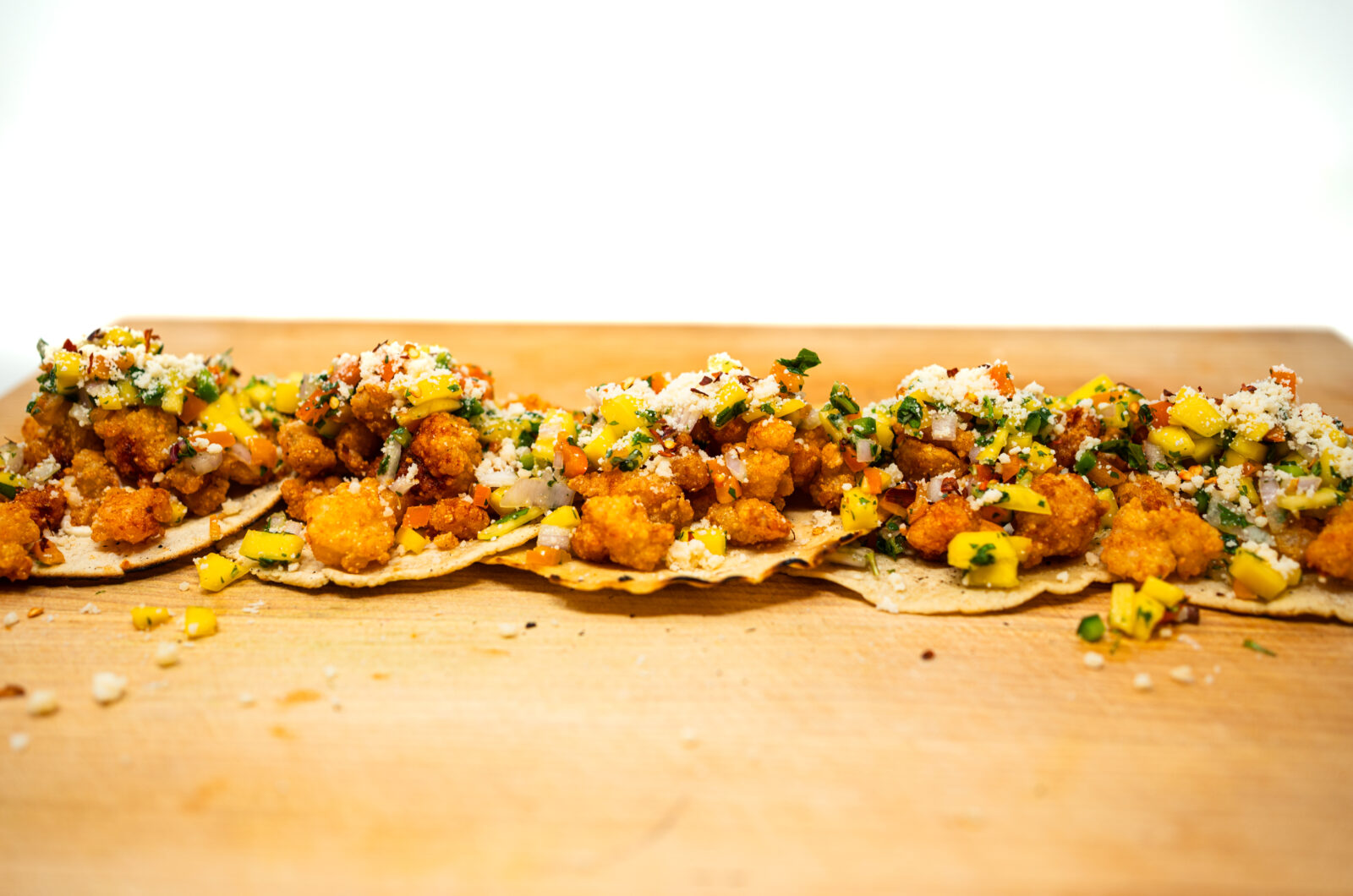 Popcorn Shrimp Tacos with Mango-Caper Salsa and Whipped Farmer’s Cheese