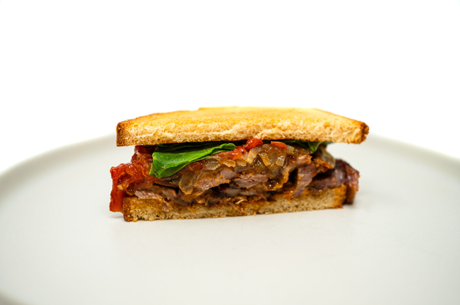 The sandwich starts with quality bread, thick slices lightly toasted to hold up to the juicy fillings. Crisp lettuce adds freshness and crunch, while the caramelized onions and roasted tomatoes bring sweetness and acidity to cut through the richness. The slow roasted pork belly is the star, offering tender shreds and crisp edges in every bite. This is not a rushed lunch. This is a slow-crafted, full-flavored experience.