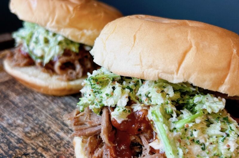 - Assemble the sandwich. Place pulled pork, bbq sauce, and creamy broccoli slaw, in that order, between a white sandwich bun.