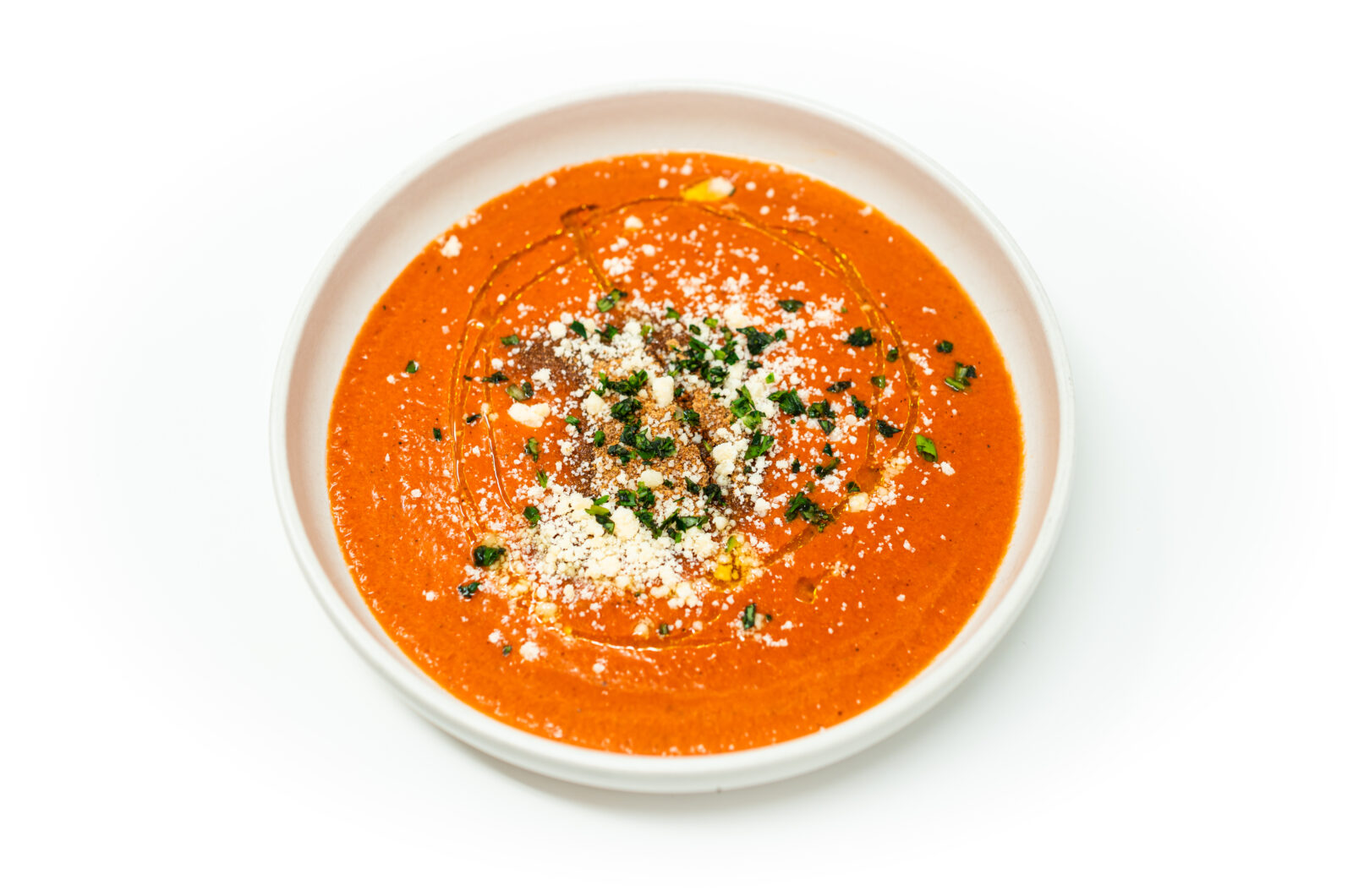 Ladle chilled gazpacho into bowls. Garnish with toasted breadcrumbs, a drizzle of extra virgin olive oil, grated Parmesan, and freshly chopped basil.