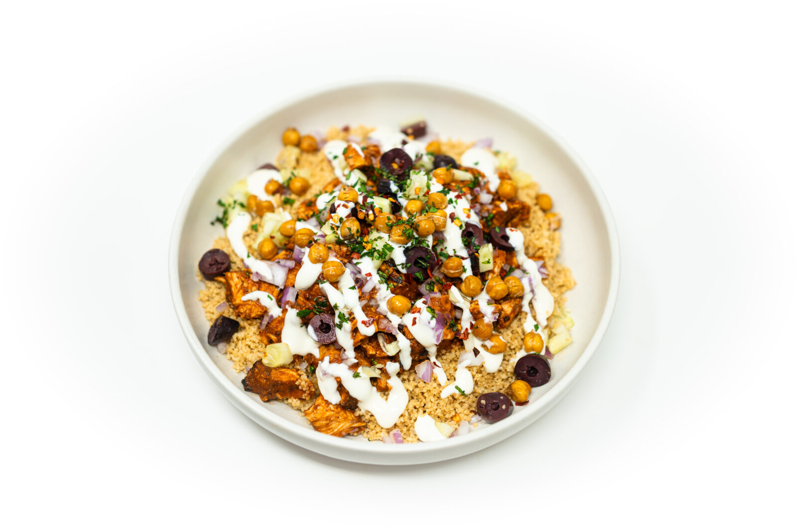 Poached chicken gets tossed in a quick tomato paste harissa and served over fluffy couscous with toasted chickpeas. Lemon tahini aioli, cucumbers, red onion, olives, and parsley keep it bright and balanced for a fast weeknight bowl.