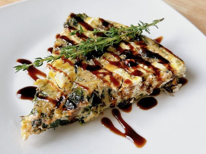 Red spinach, baby portobello mushrooms, onion, garlic, thyme, and goat cheese combine to create a quick, easy, and delicious frittata