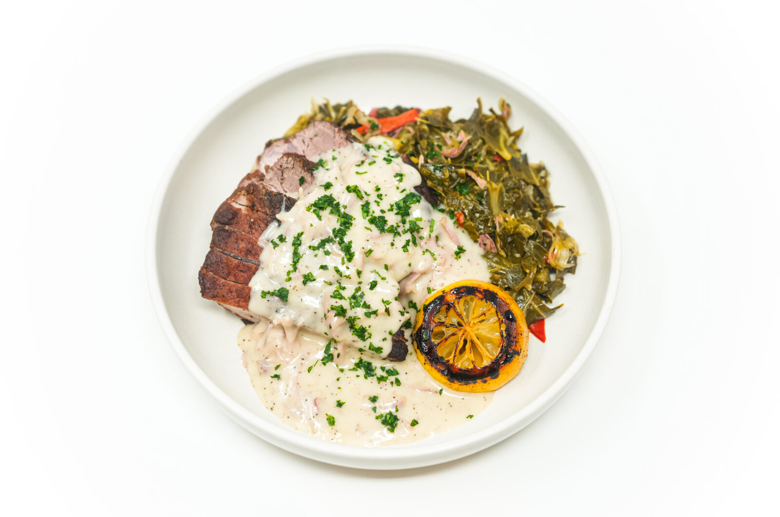 Slice the slow-roasted pork sirloin and arrange it on a plate. Ladle the ham gravy over the pork. Serve with a generous portion of braised collard greens on the side. Garnish with a charred lemon slice and freshly chopped parsley.