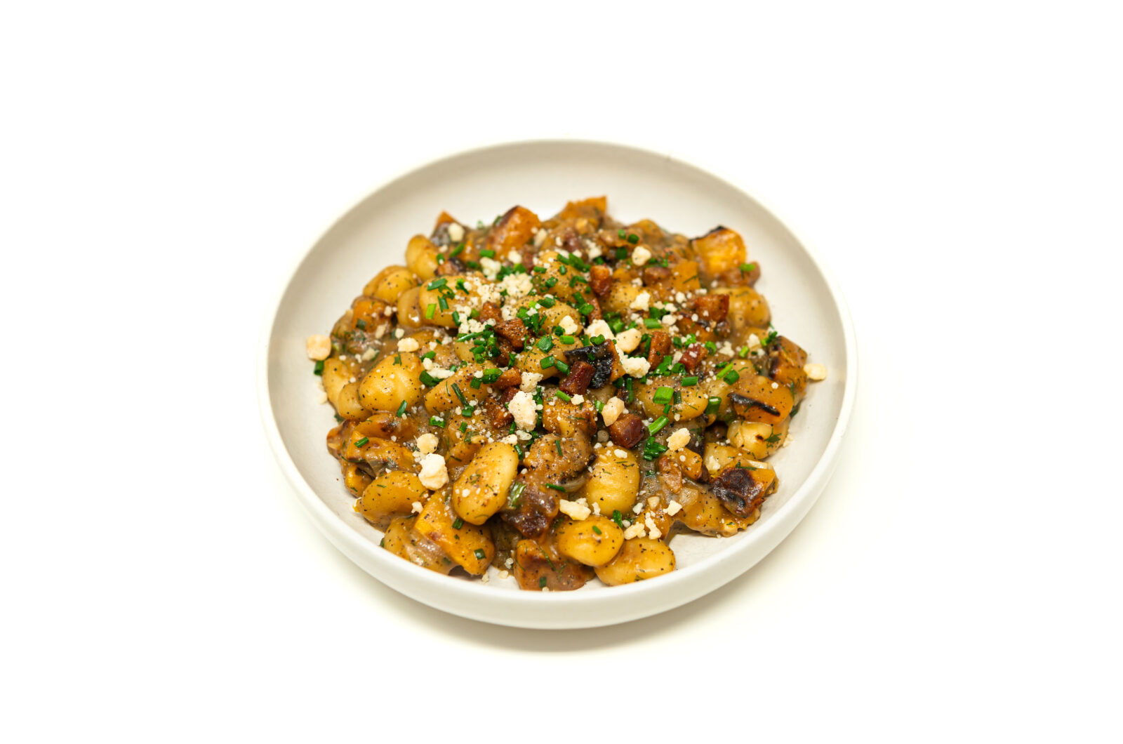 - Add the seared gnocchi, crispy pancetta, and roasted acorn squash back into the skillet. Gently toss everything until beautifully coated in the warm sauce. Divide among pasta bowls. Top generously with grated Parmesan cheese, fresh chopped chives, and cracked black pepper. Serve immediately.