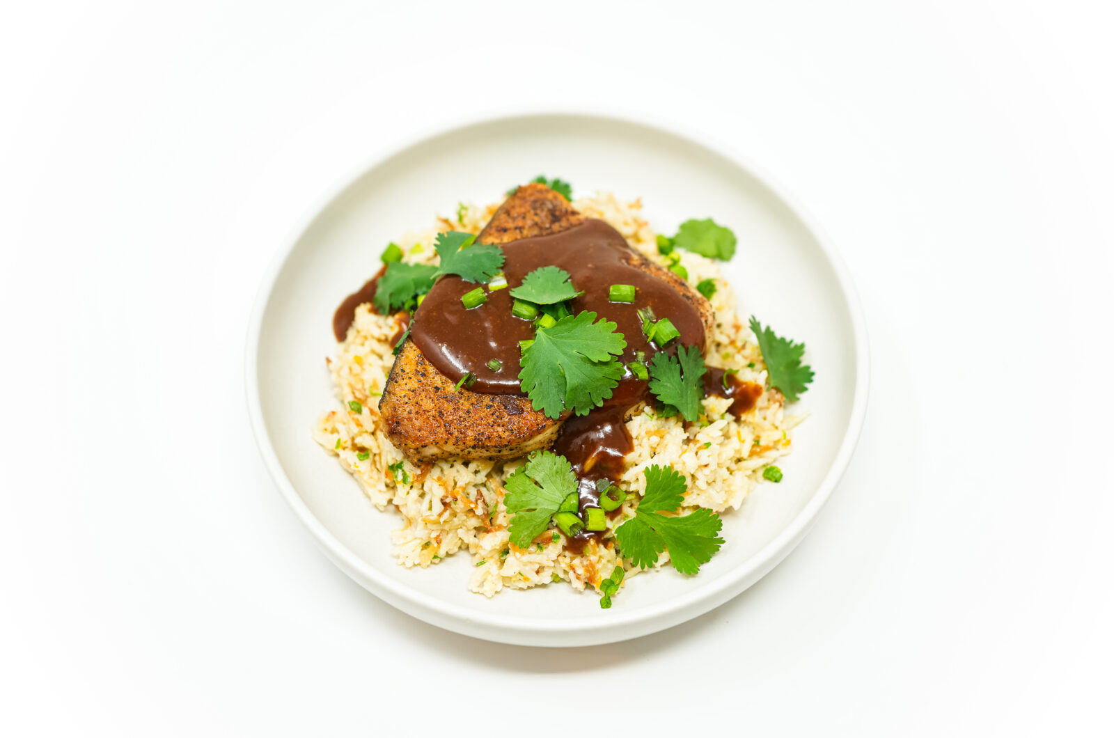 Plate the swordfish over the caramelized coconut rice and drizzle with the mango sauce. Garnish with fresh cilantro and chopped green onion.