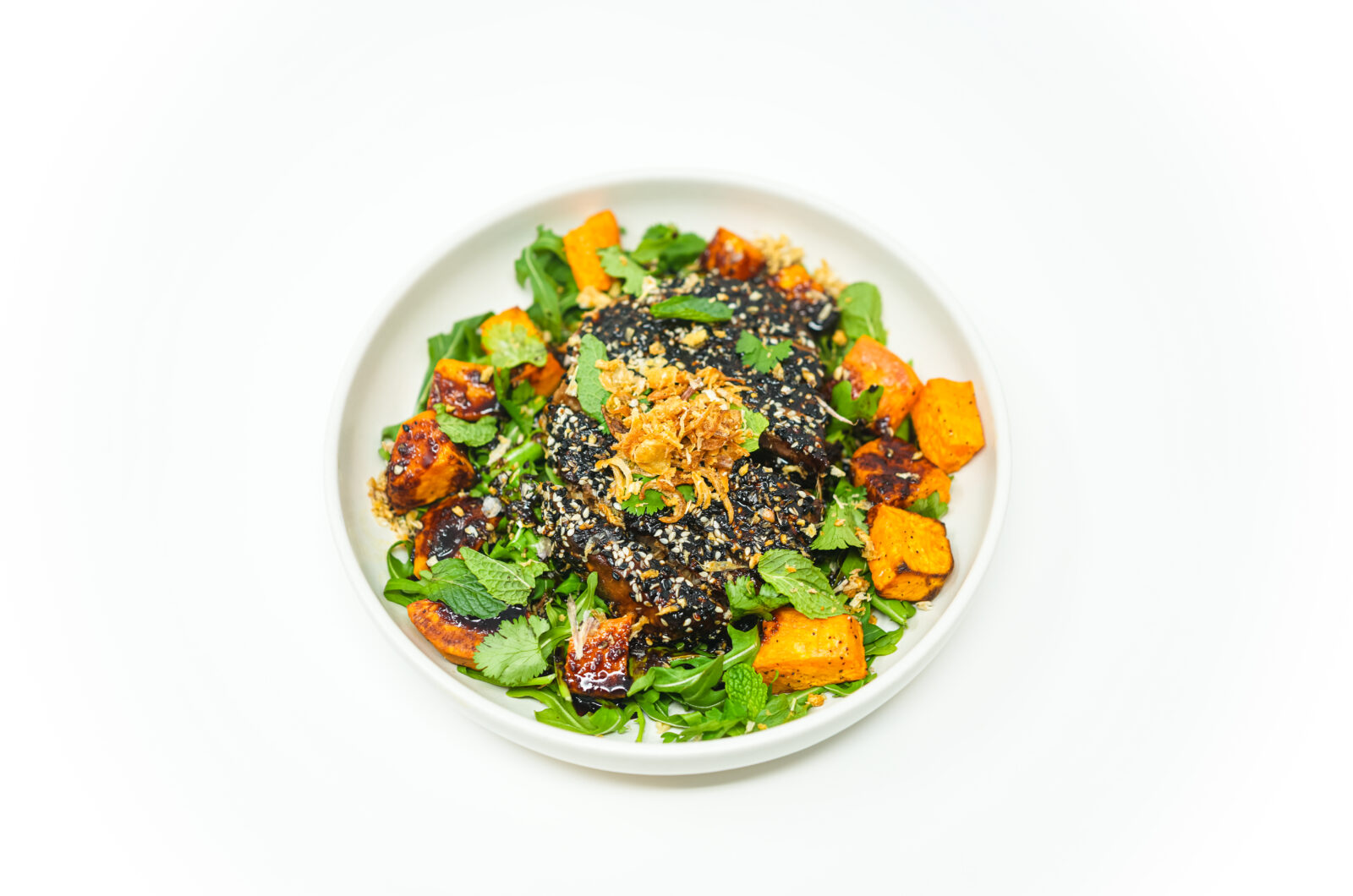 Arrange the arugula on a plate. Drizzle the ginger sesame glaze over the tuna. Top with roasted sweet potatoes, sesame-crusted tuna slices, cilantro, and mint. Garnish with crispy shallots and toasted sesame seeds.