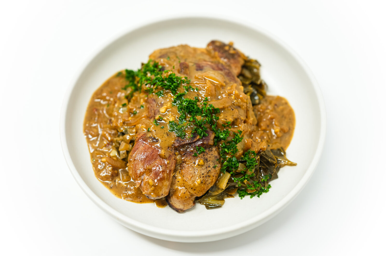 This isn’t just visually appealing—it’s functional. The hearty greens provide the perfect base for soaking up the savory gravy, while their slight bitterness and tanginess cut through the richness of the pork and cream sauce. A garnish of freshly chopped parsley adds a pop of color and bright, herbaceous aroma that complements the deep, savory flavors.