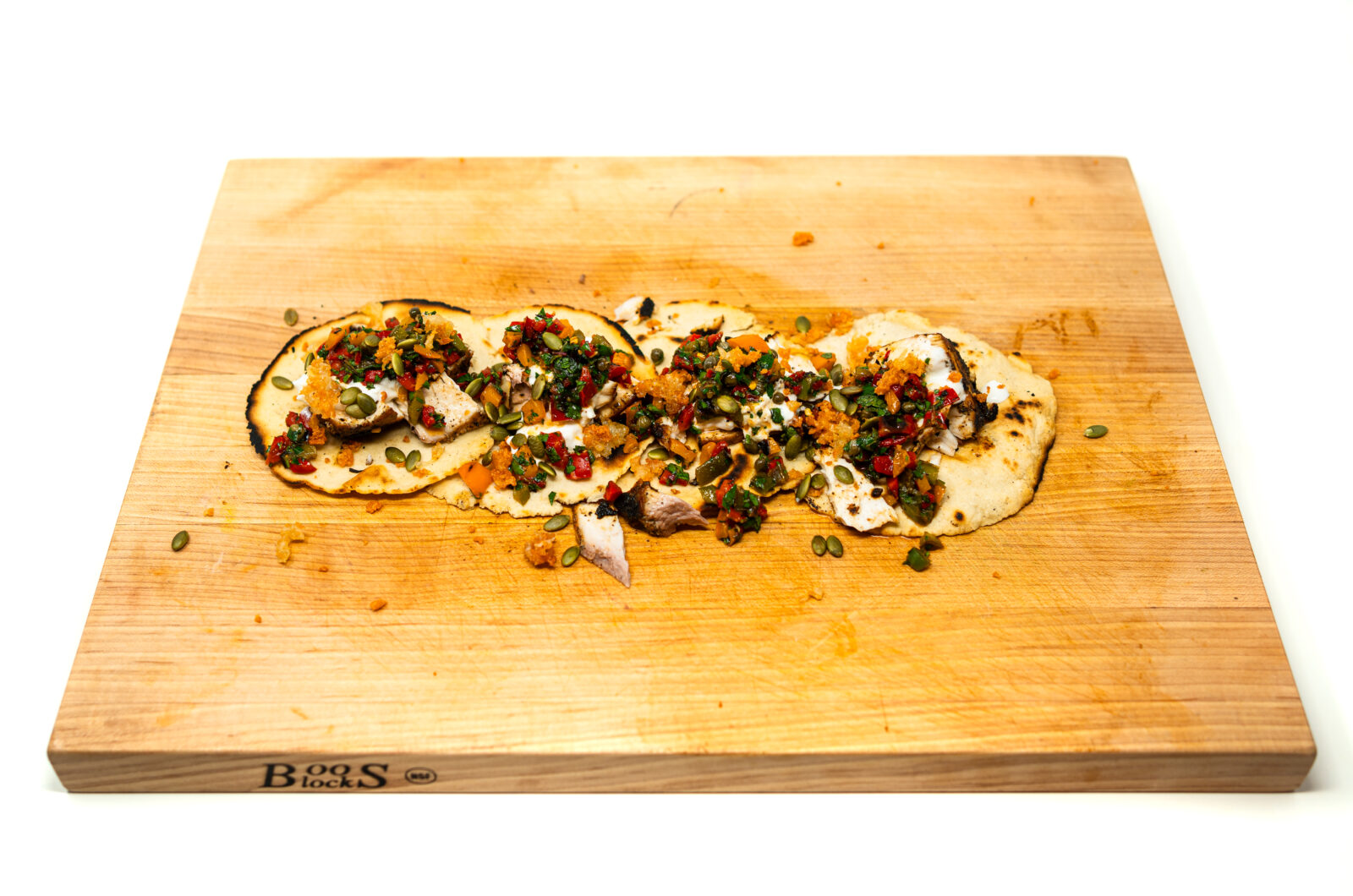 - Warm and lightly char the corn tortillas directly over a gas flame or in a hot, dry skillet until pliable. Lay out the warm corn tortillas. Pile on the spiced amberjack chunks. Add a dollop of the chilled burrata cream. Spoon a generous amount of the minted tri-color pepper relish over the top. Garnish with the crispy, fried burrata shell pieces.