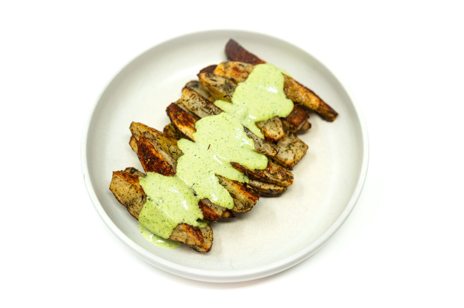 What takes these potatoes further is the creamy jalapeño herb sauce spooned over the top. It’s the same blend that brings balance to jerk wings, built from jalapeños, fresh herbs, lime, and sour cream. The sauce cools, brightens, and adds lift to the heavier roasted potatoes. Together, they create something that feels alive with flavor yet rooted in simplicity.