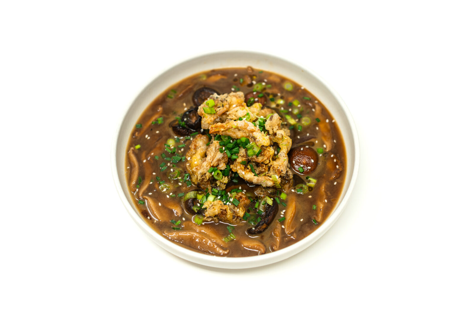 - Ladle the broth into shallow bowls. Pile the crispy oyster tempura high in the center. Garnish generously with scallions and toasted sesame seeds.