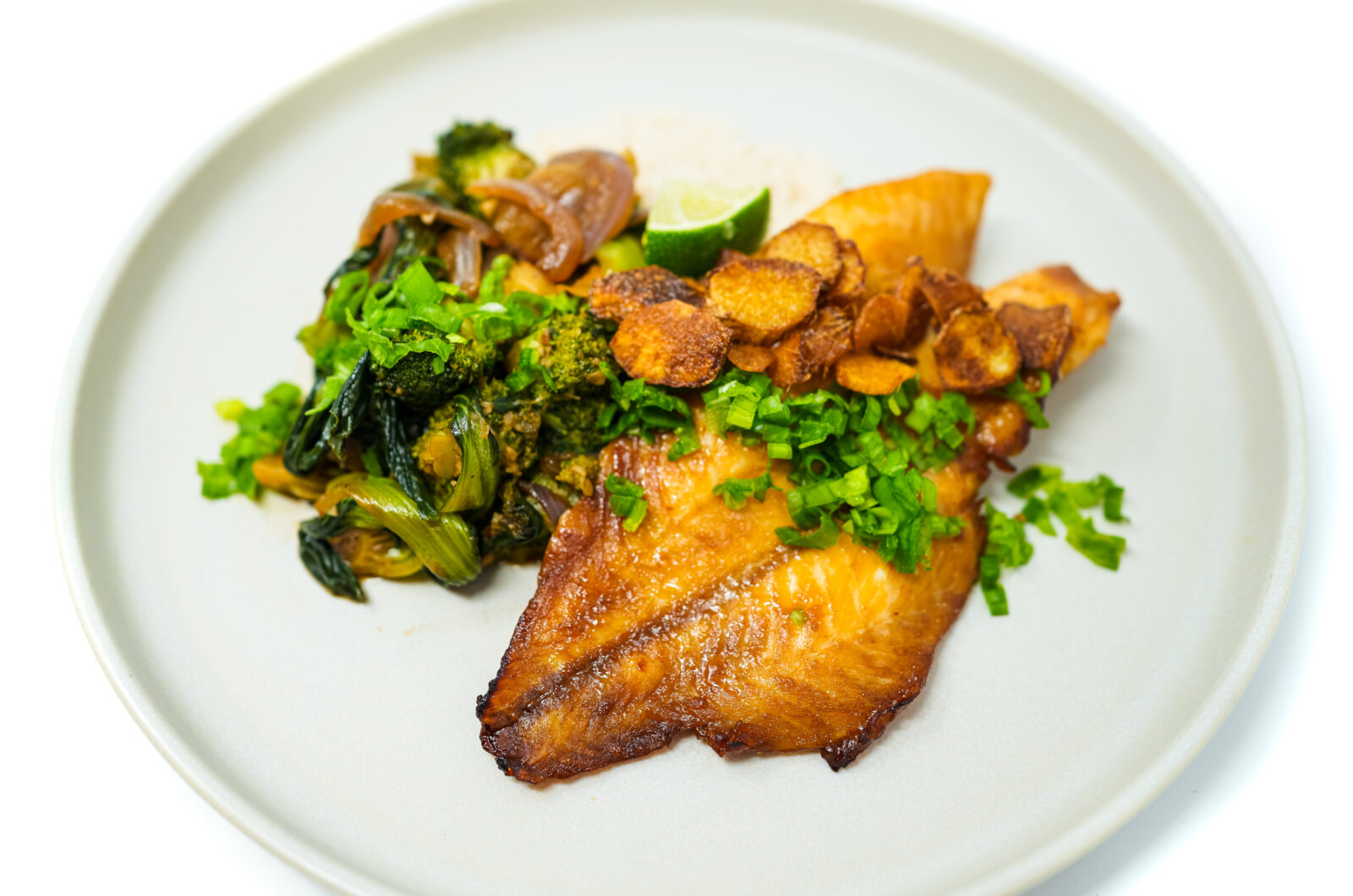 Divide the cooked jasmine rice among plates. Top with the roasted orange roughy fillets. Serve a portion of the stir-fried bok choy and broccoli alongside the fish. Garnish each plate with a lime wedge, chopped green onions, and fried ginger, if desired.